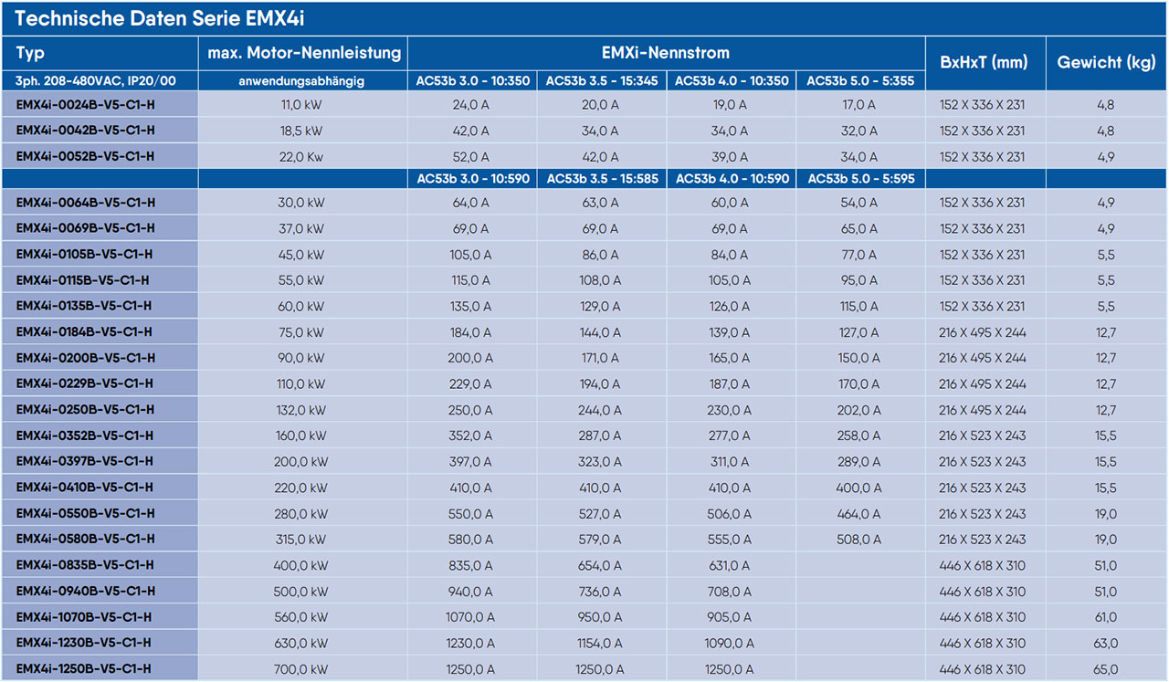 Modernste Softstarter-Technologie für anspruchsvolle Anwendungen – Die EMX4i-Serie von AuCom hebt die Softstarter-Technologie auf ein neues Niveau. Mit einem Leistungsbereich von 24 A bis 1250 A und einer breiten Modellauswahl eignet sich die Serie für anspruchsvolle industrielle Anwendungen. Intelligente Funktionen wie die Smart-Karten-Technologie und die Pocket Technician App machen den EMX4i zu einem unverzichtbaren Bestandteil moderner Motorsteuerungen.