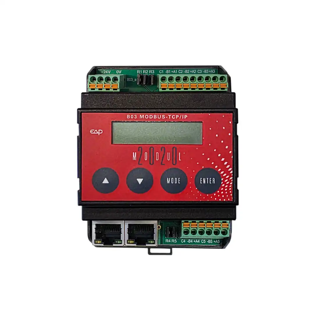 Beim Basismodul B03 sind zusätzlich Modbus TCP/IP, ein integrierter 2-Port-Switch (für linienförmige Verkettung ohne externen Switch) und ein 5-fach Modbus-RTU-Gateway an Bord – ideal, um mehrere RS-485-Stränge (z. B. Sensoren/Fühler, Zähler, Aktoren) zentral ins Ethernet/SCADA einzubinden.