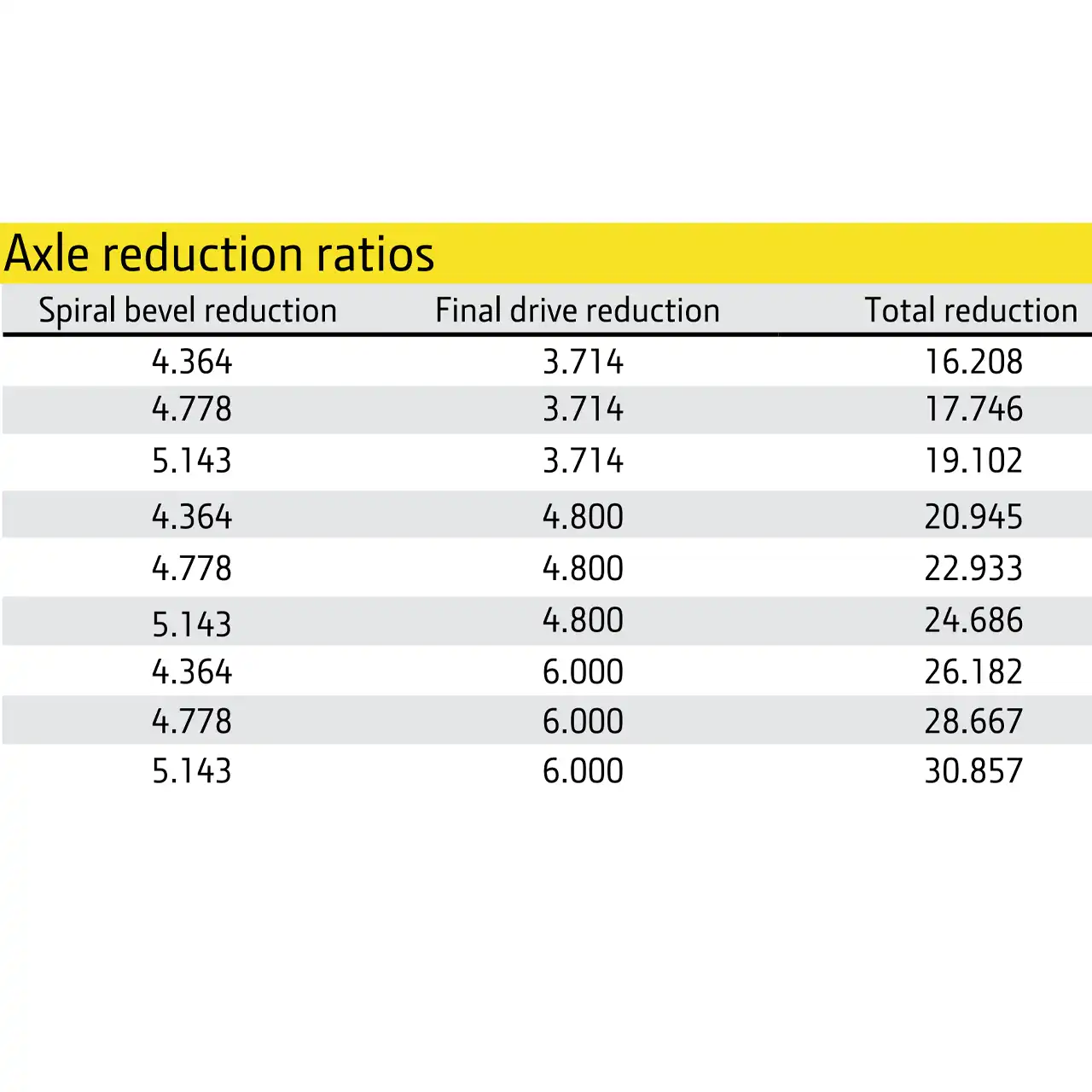 | Bereich (gesamt) | 16,208:1 – 32,914:1 (Kombinationen aus Spiral-Kegelrad & Planetenstufe) |