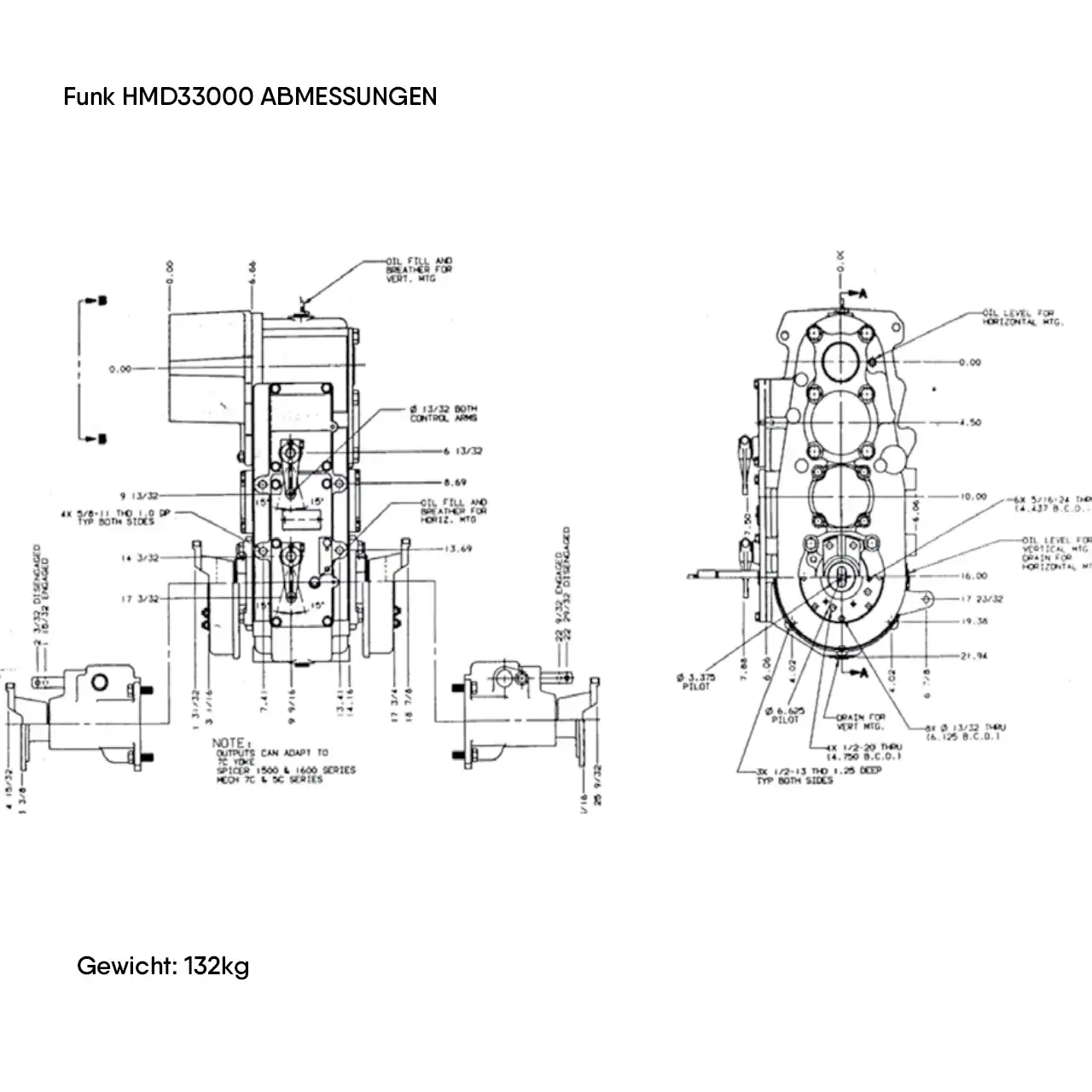 | Abtriebsanschlüsse | Kompatibel mit Spicer Serie 1500 und 1600; Mechanics 7C Kreuzgelenk-Flanschgabel (U-Joint) |