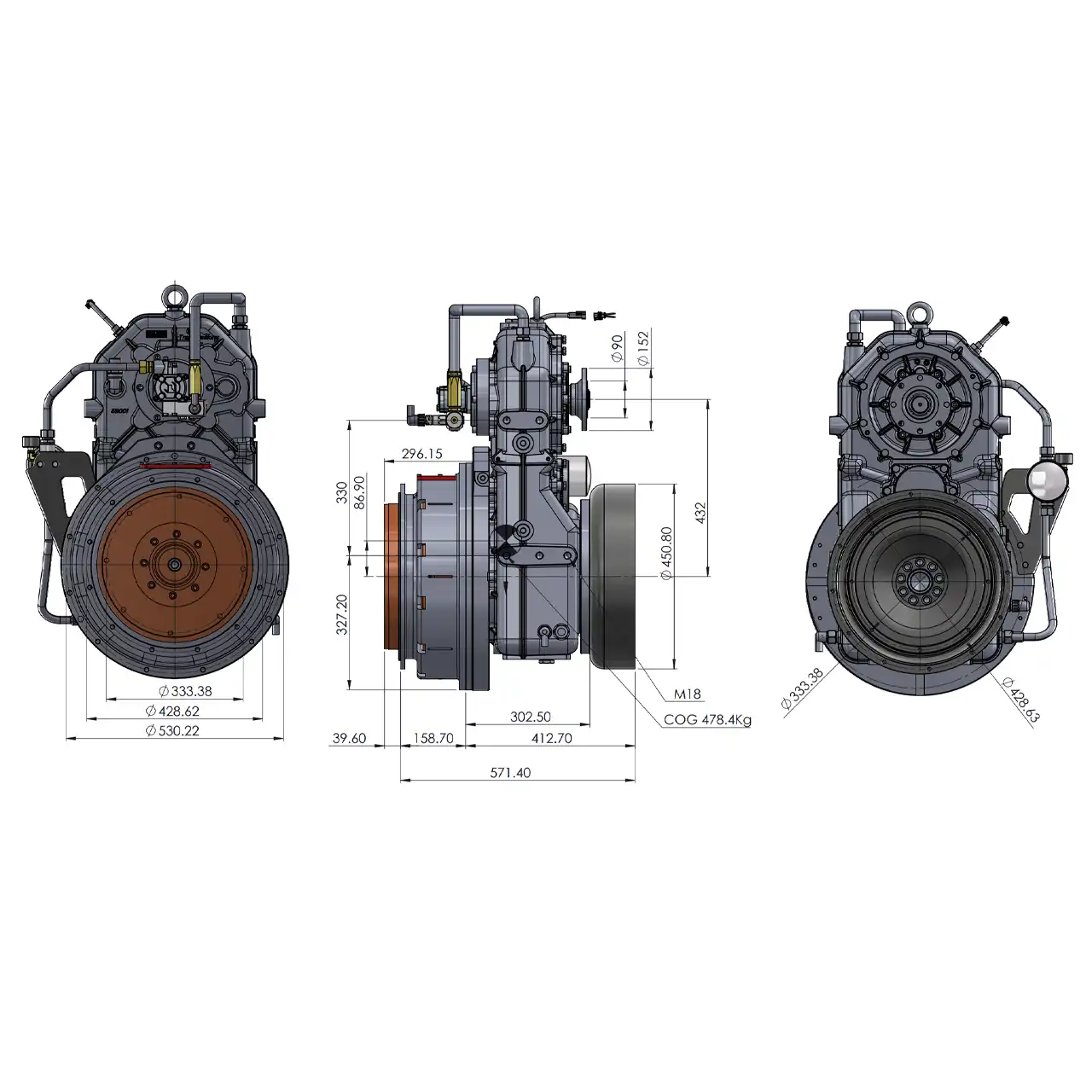 | Einbau | Zwischen Diesel und Marinegetriebe/Kupplung; kundenspezifische Verbindungen für Marine & Industrie |