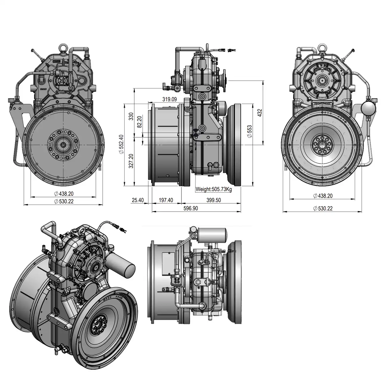 | Einbau | Zwischen Diesel und Marinegetriebe/Kupplung; kundenspezifische Verbindungen für Marine & Industrie |